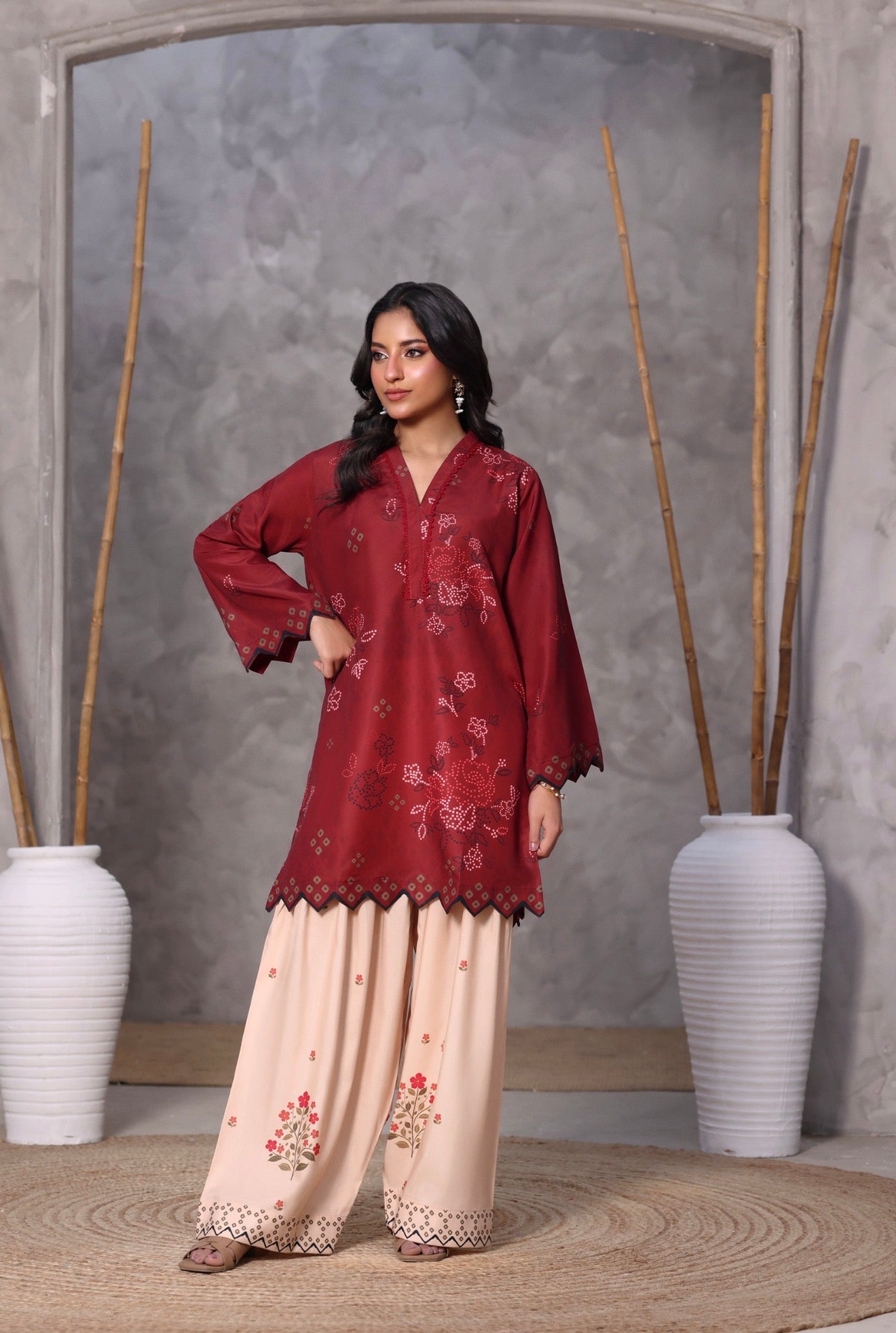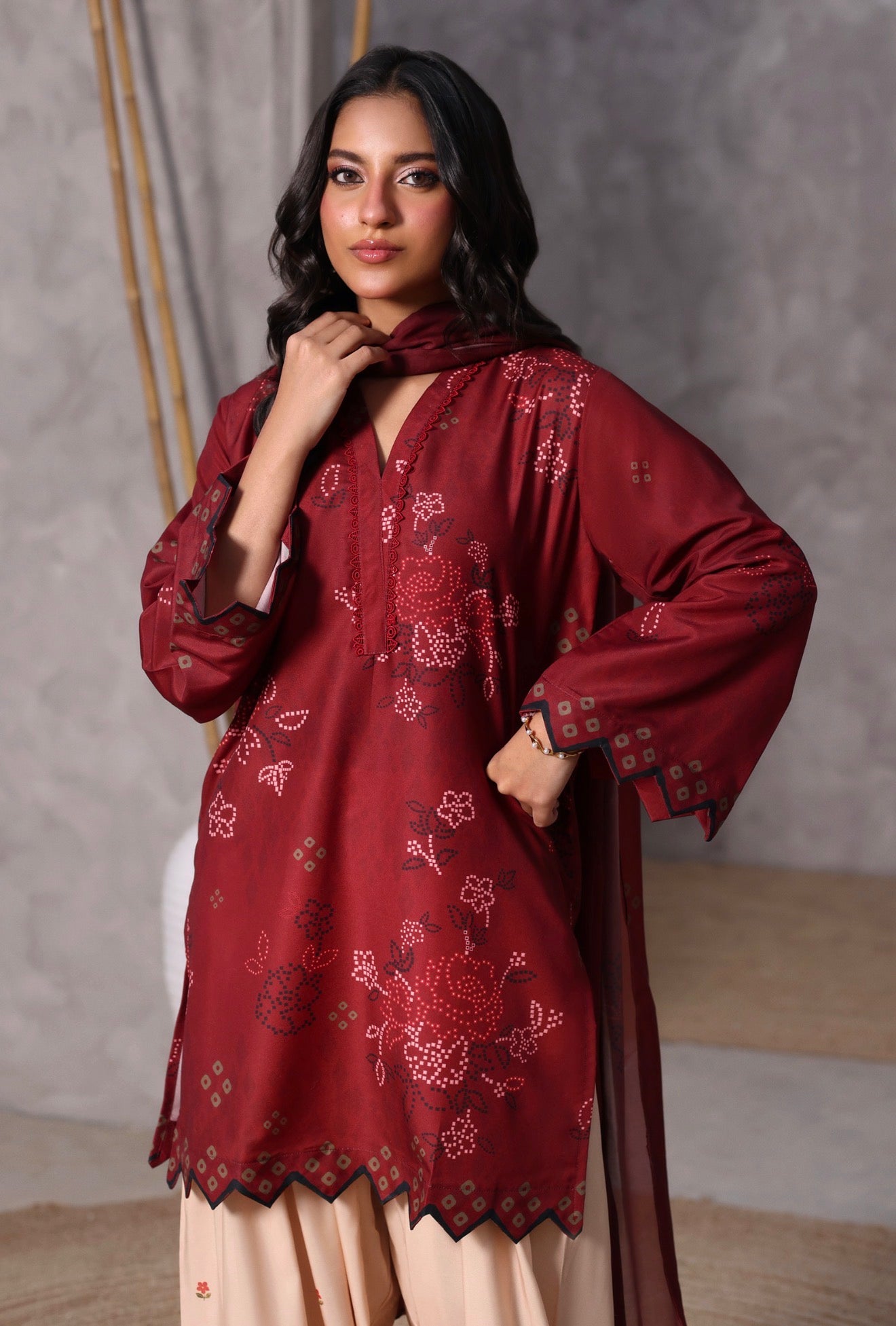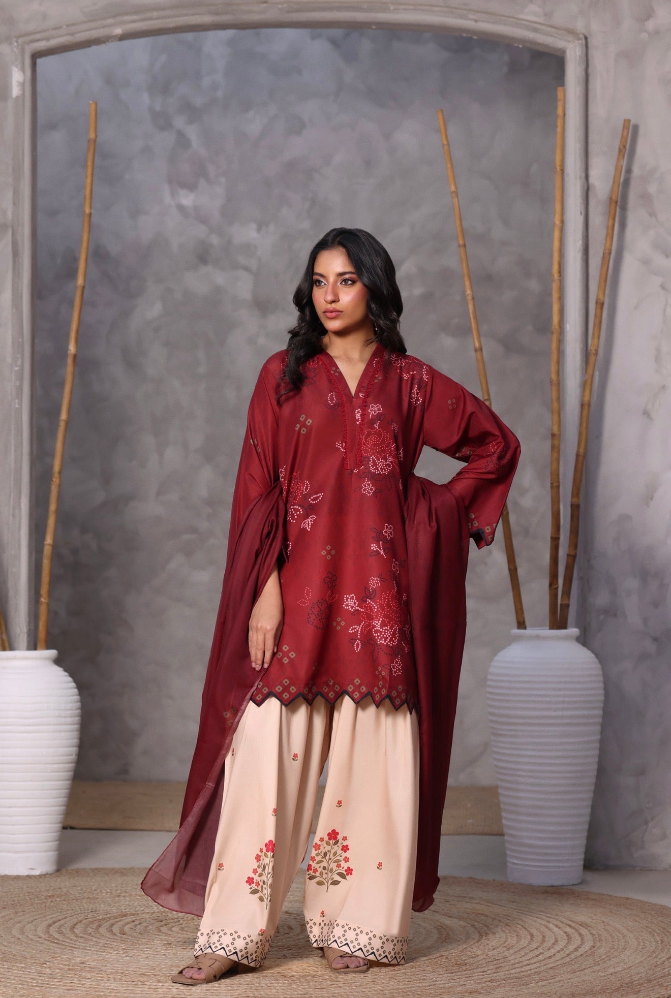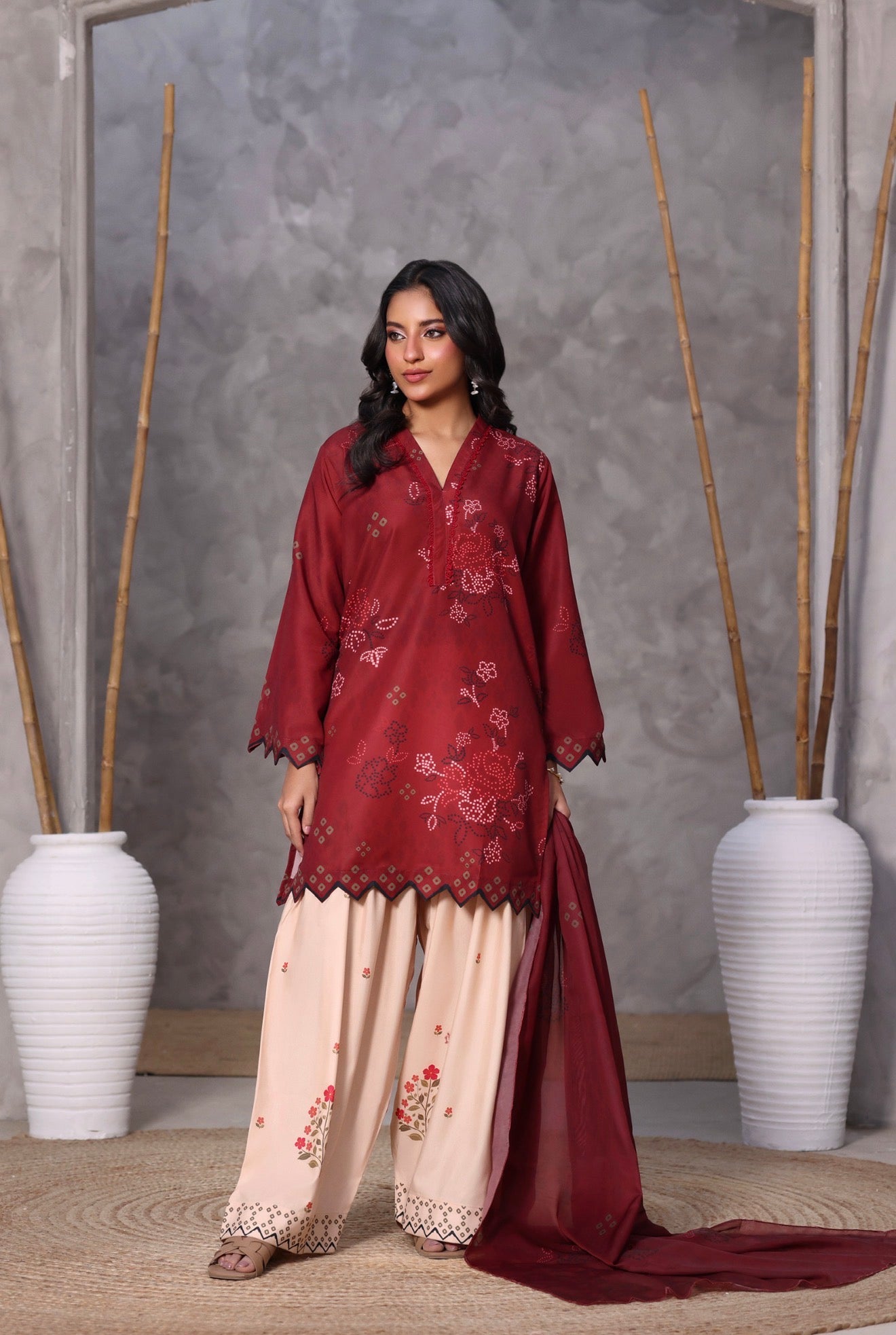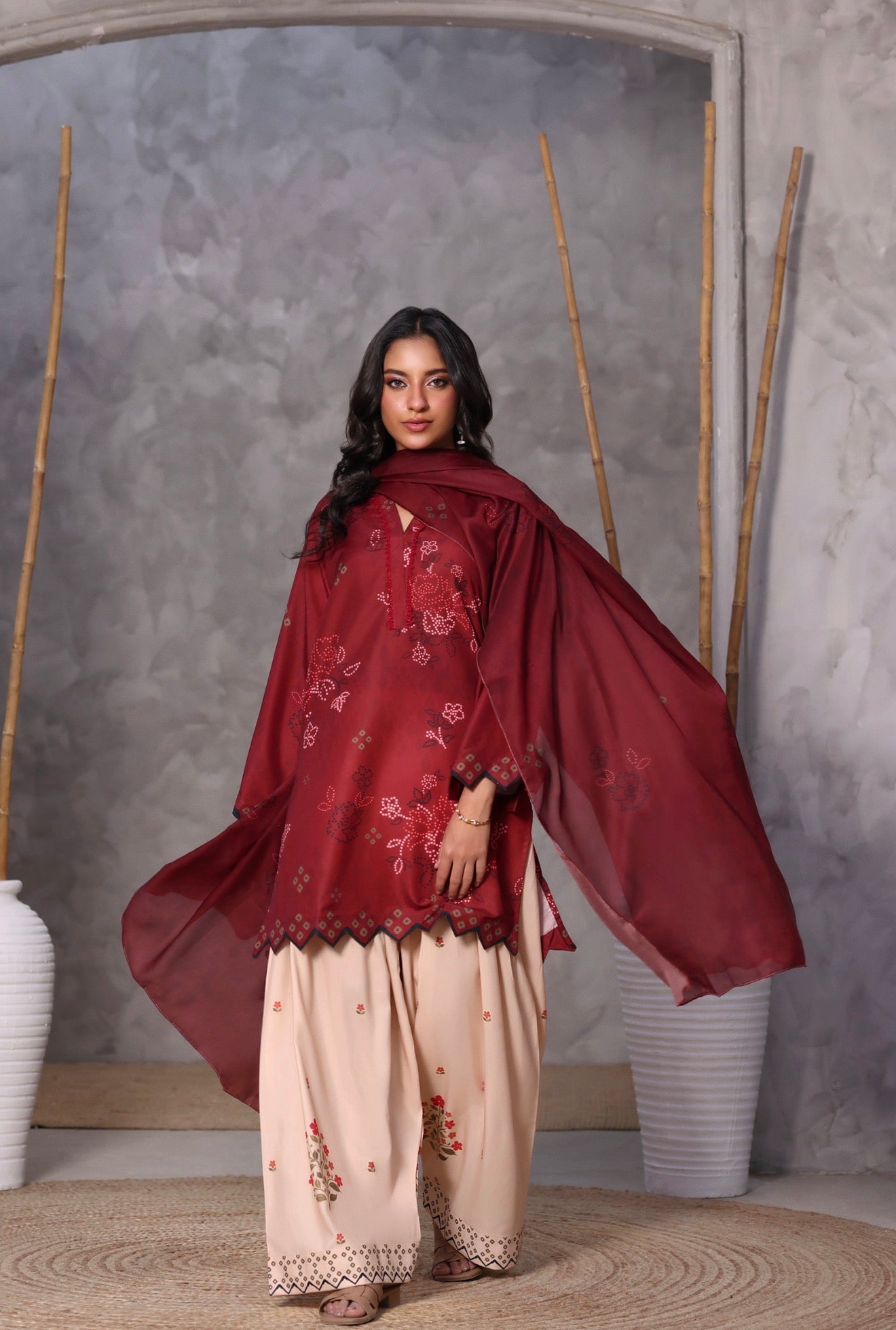 Available in both 2-piece and 3-piece options with an apple silk dupatta. The model is wearing the medium-length variant in size Small. Height 5”3.