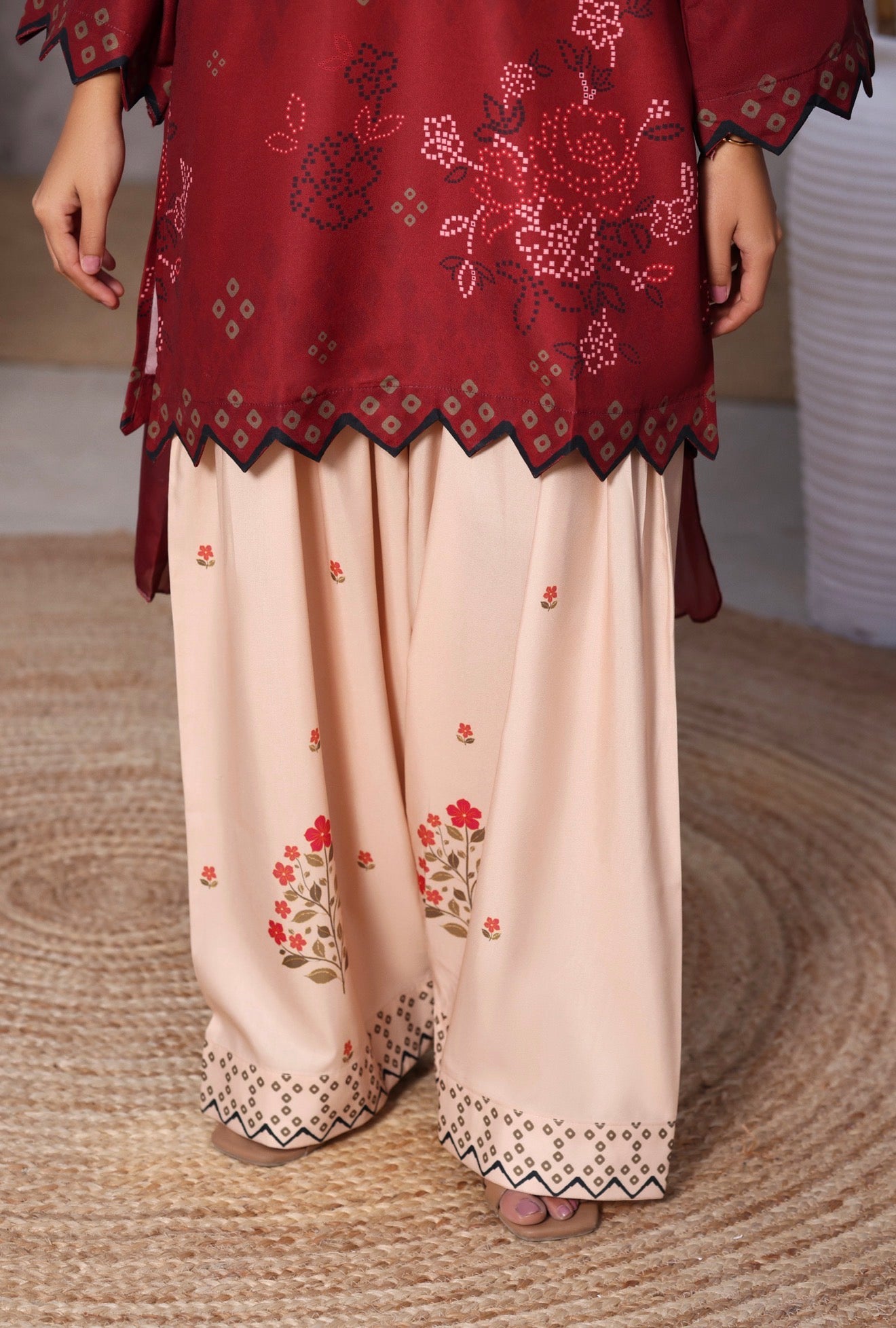 Designed in our in-house blended cambric, this ensemble features intricate cutwork detailing on the shirt and sleeves border. It is paired with a statement farshi shalwar for a flowy, traditional silhouette.