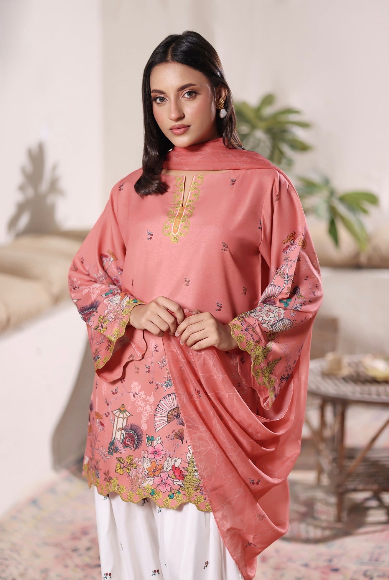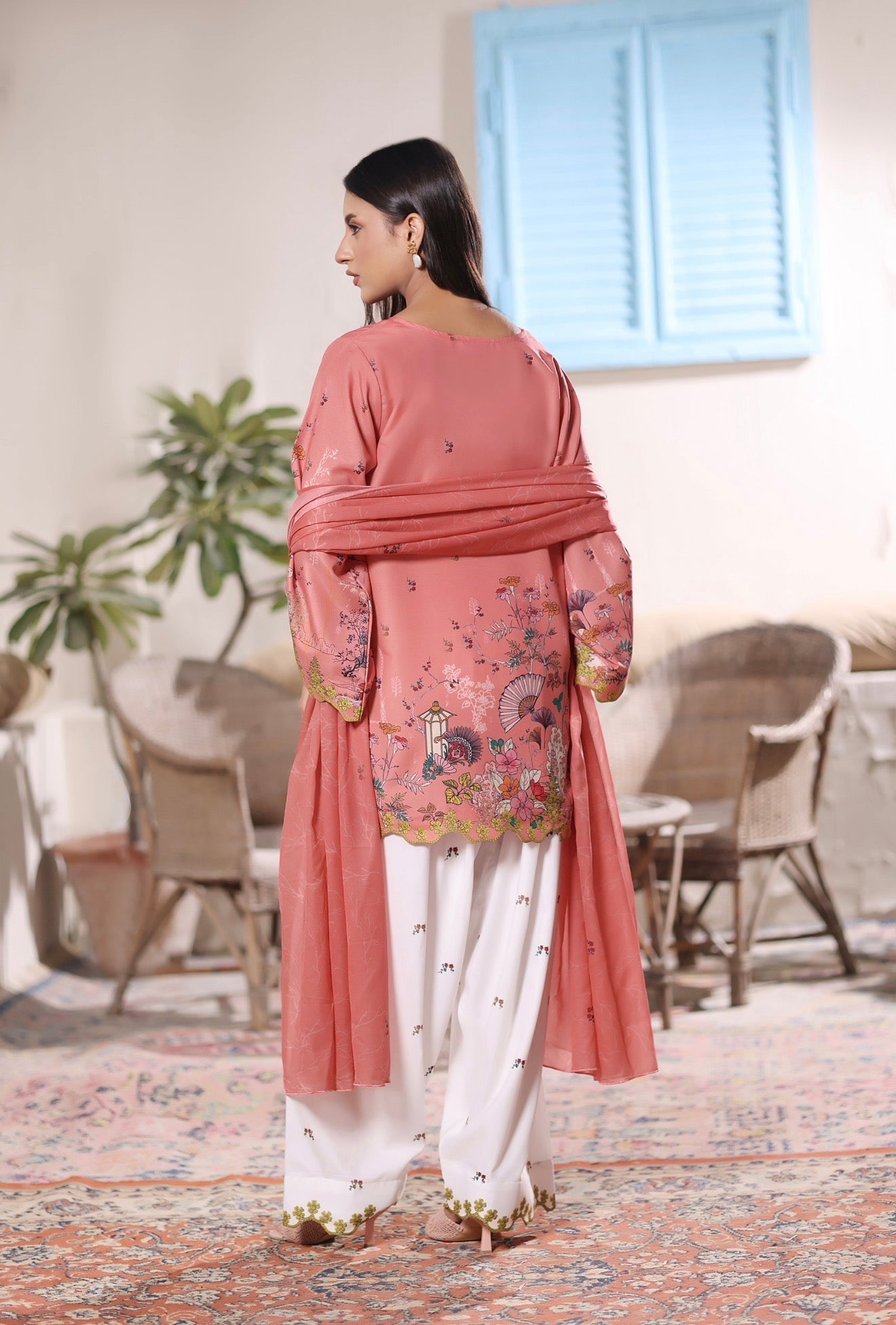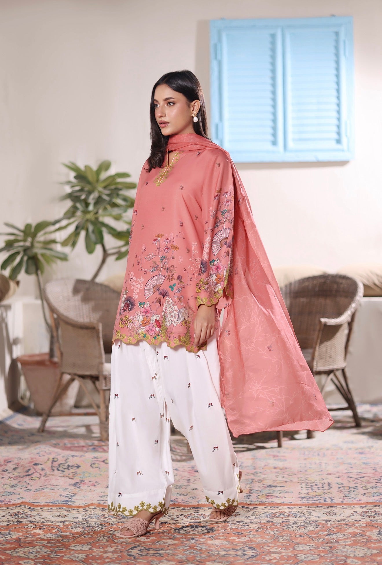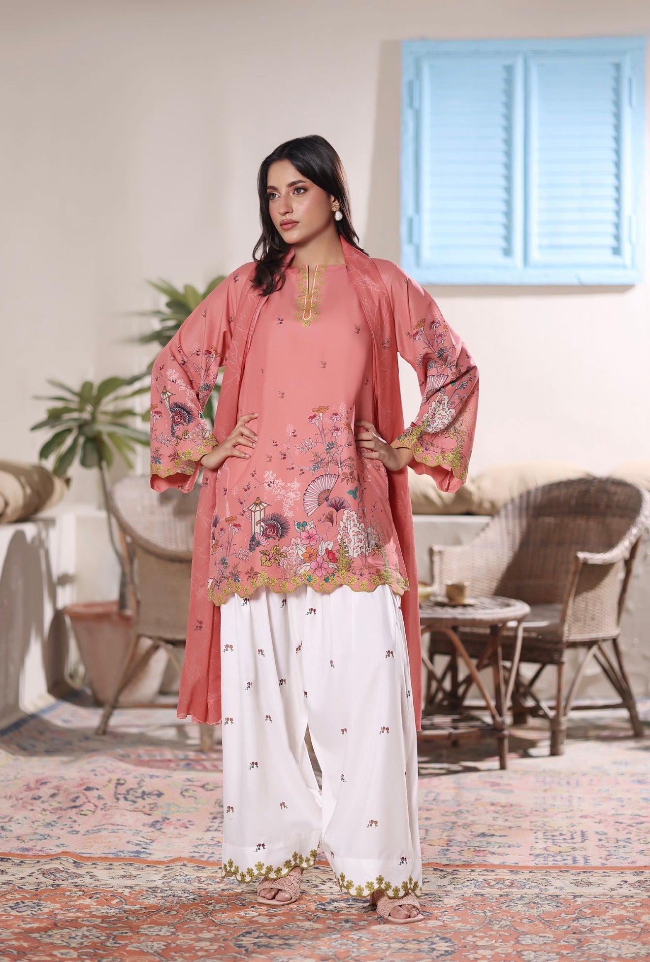 A refreshing 2-piece set that blends tradition with elegance. The shirt is adorned with vibrant shades of orange, finished with delicate cutwork scallops on the hemline and sleeves, adding a graceful charm to the look. Paired with a wide farshi shalwar, detailed with scattered floral motifs and scalloped cutwork on the trouser hem, this outfit is both eye-catching and timeless.