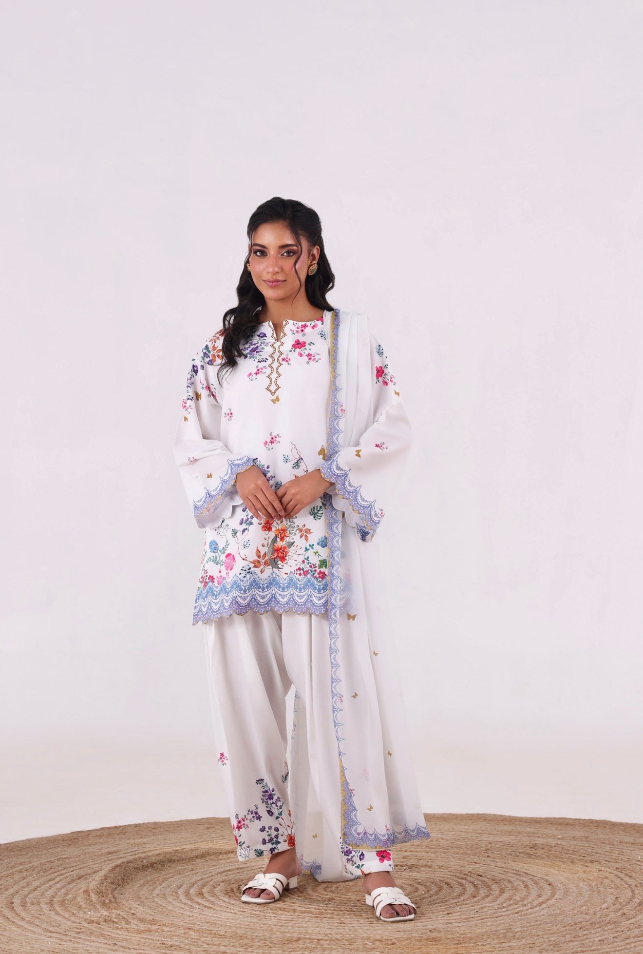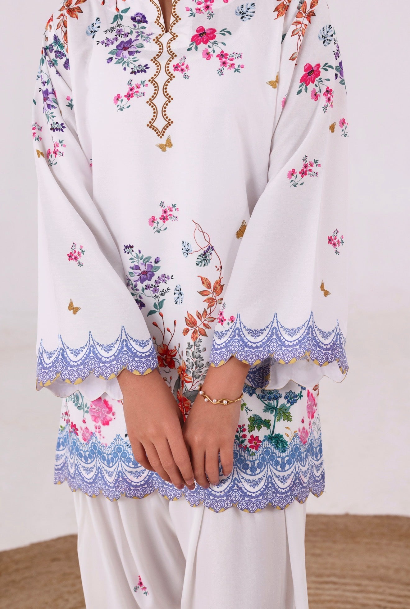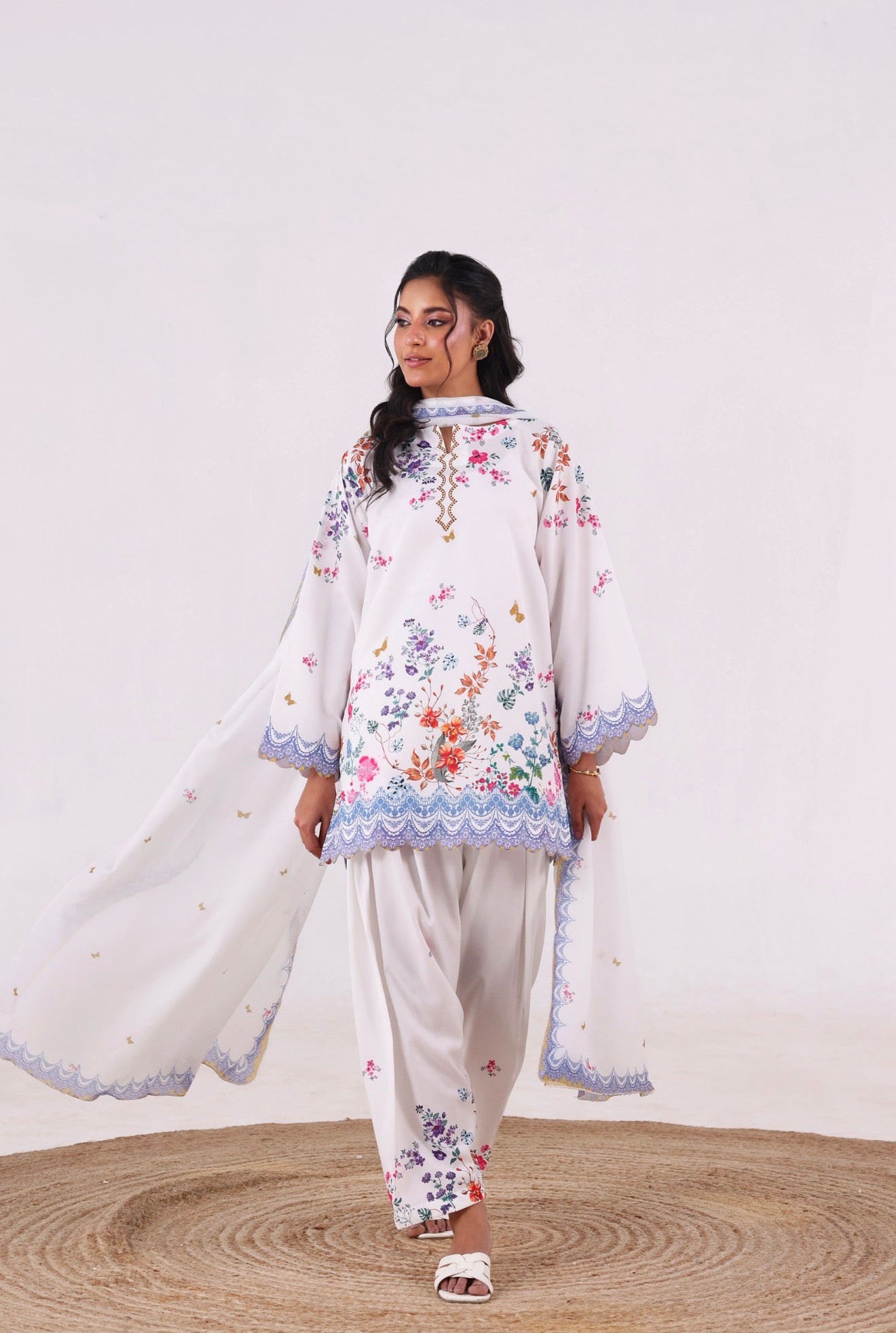 Crafted from our in-house blended cambric, this refreshing floral ensemble reflects effortless elegance. The shirt features intricate cutwork detailing on the daman and sleeves, adding a delicate, refined finish. It is paired with a classic shalwar for a timeless silhouette.