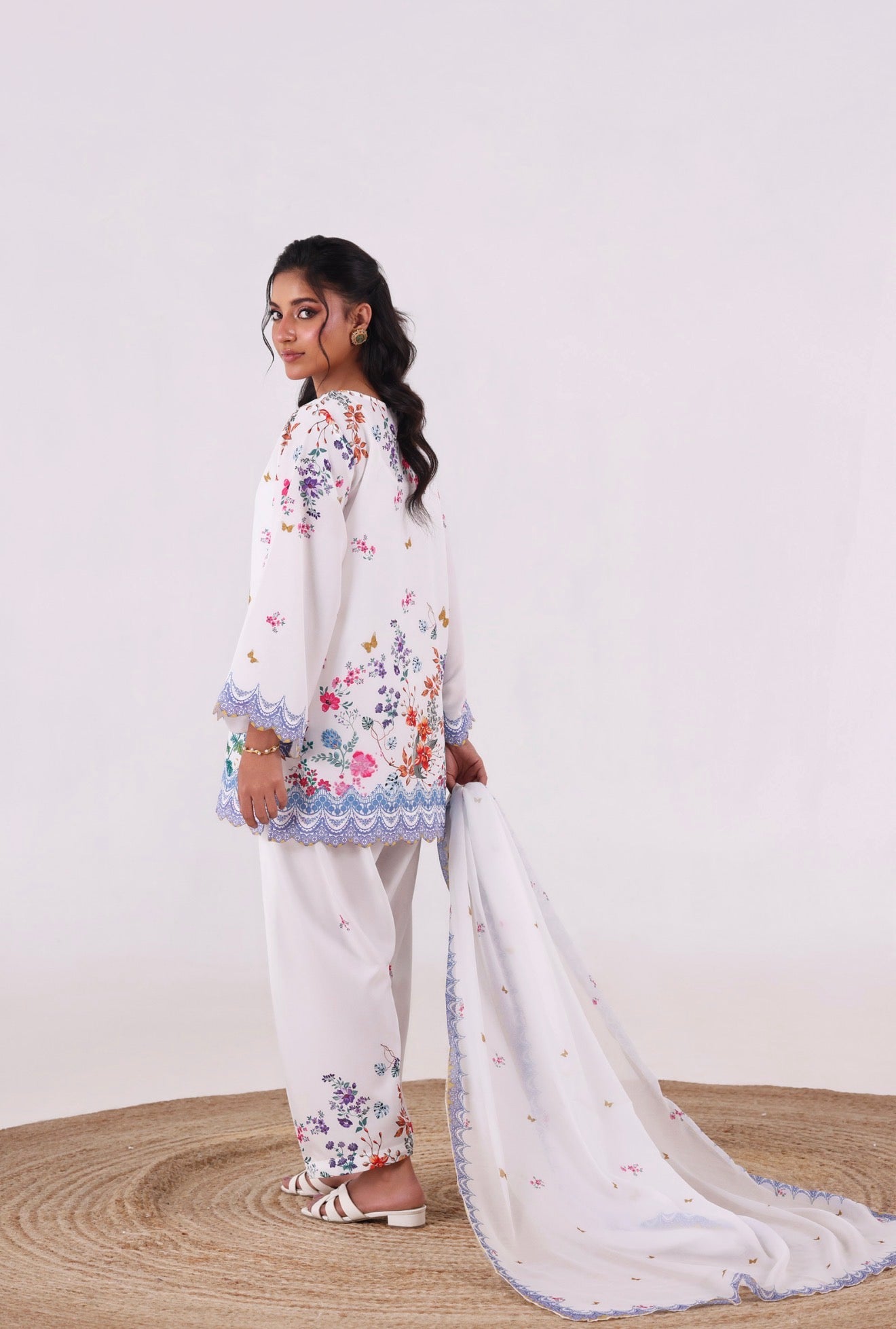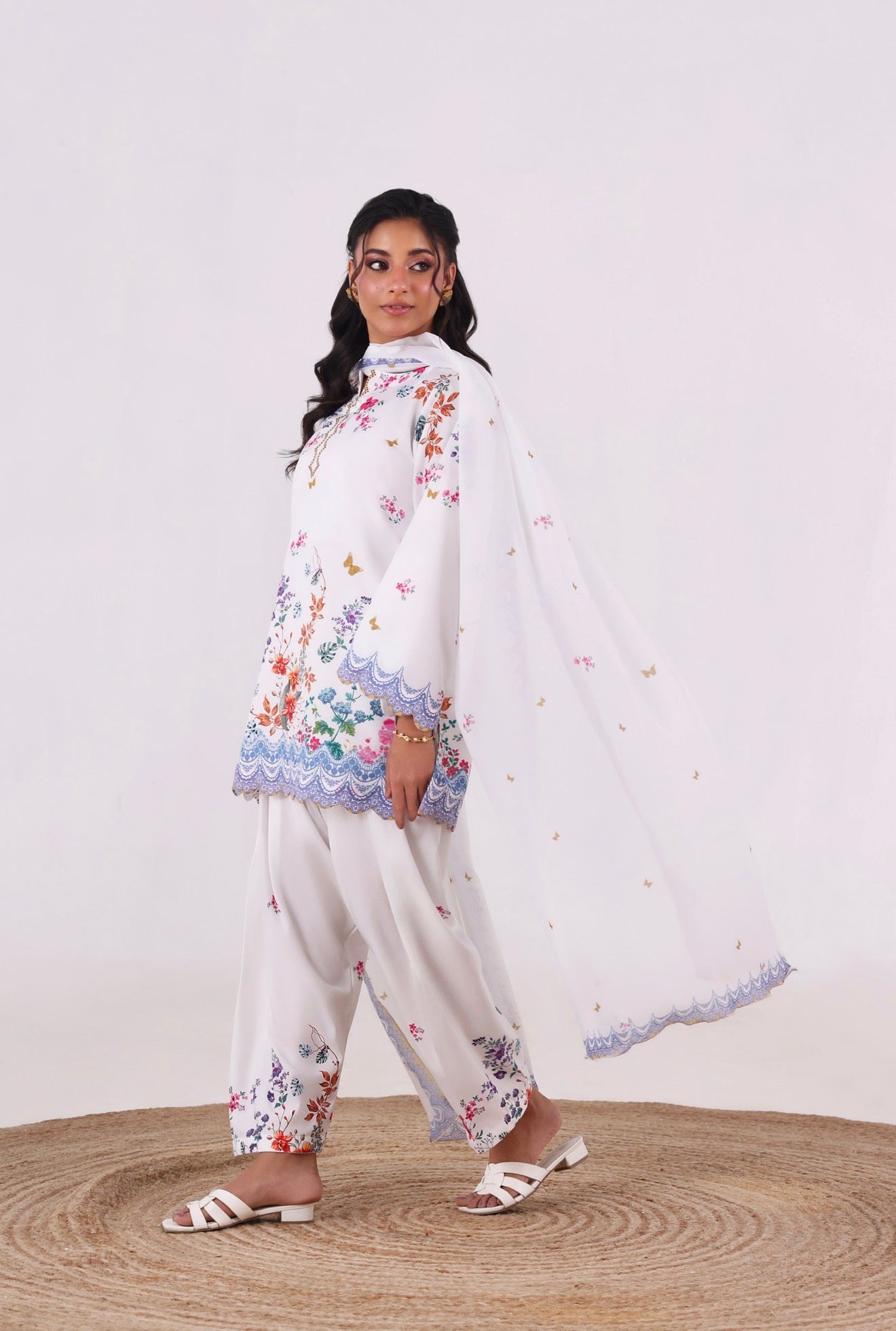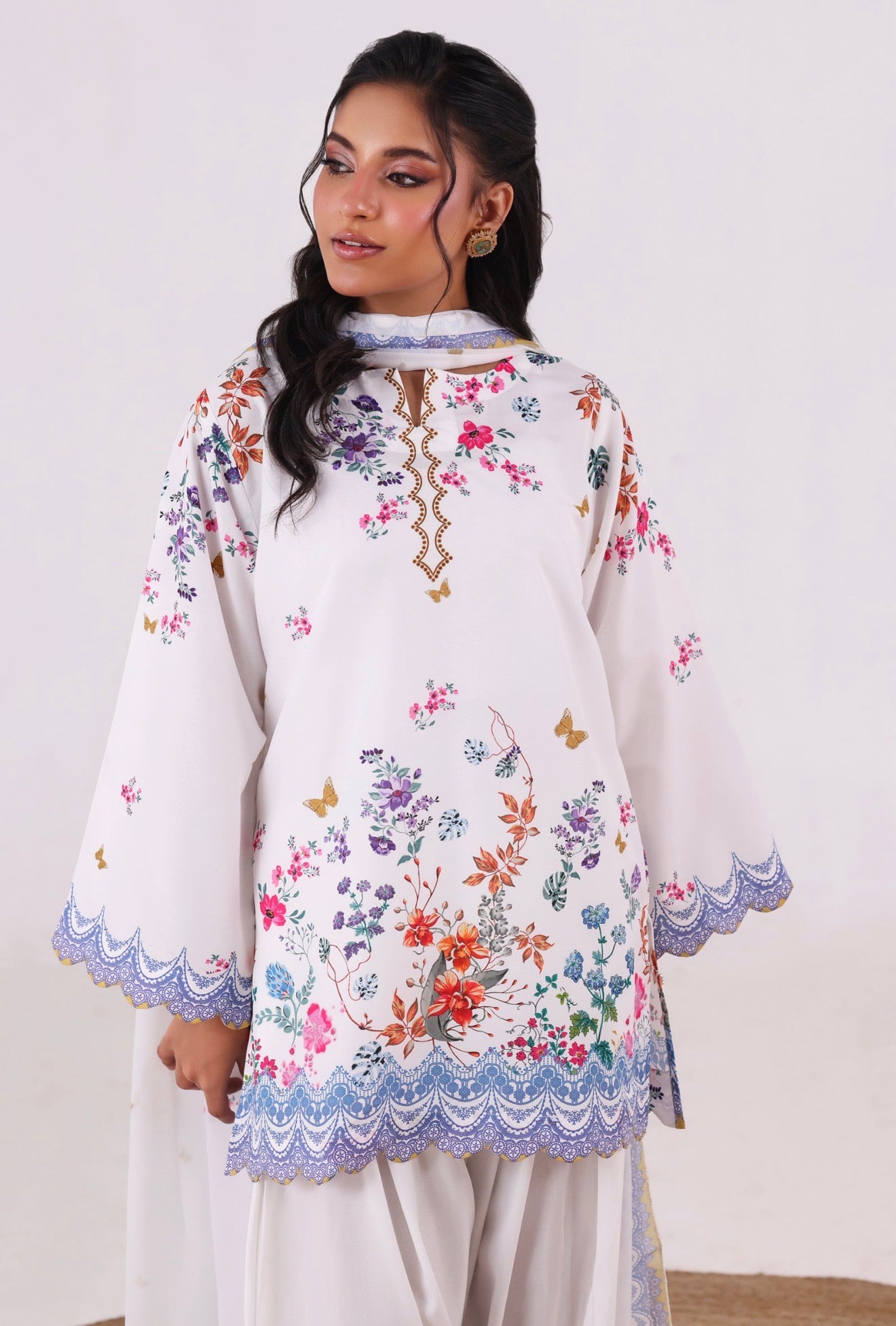 Crafted from our in-house blended cambric, this refreshing floral ensemble reflects effortless elegance. The shirt features intricate cutwork detailing on the daman and sleeves, adding a delicate, refined finish. It is paired with a classic shalwar for a timeless silhouette.