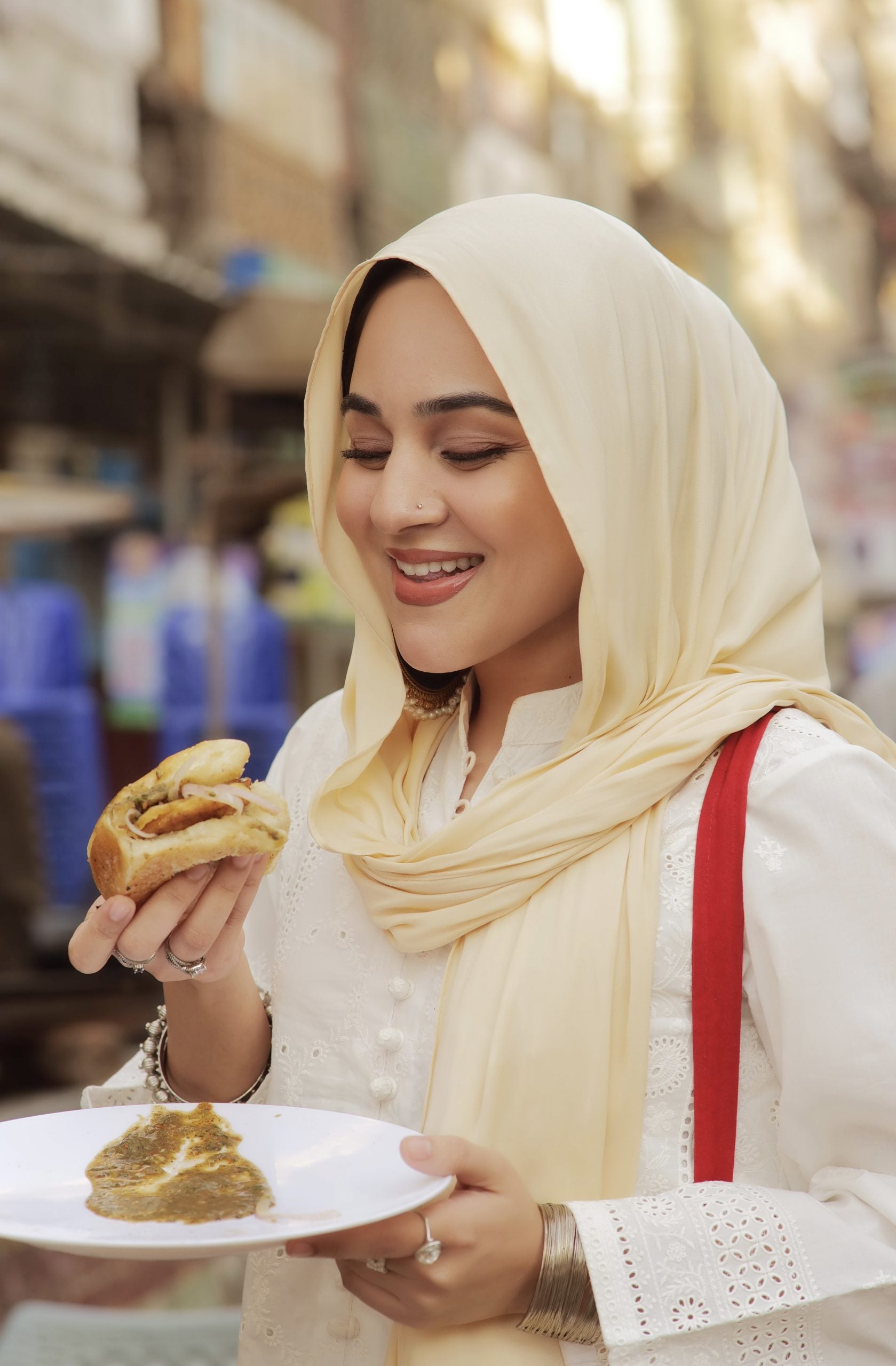 Drape yourself in a rich tapestry of flavours and tradition, this beige scarf becomes a canvas for the culinary marvel that is Karachi’s beloved bun kebab.