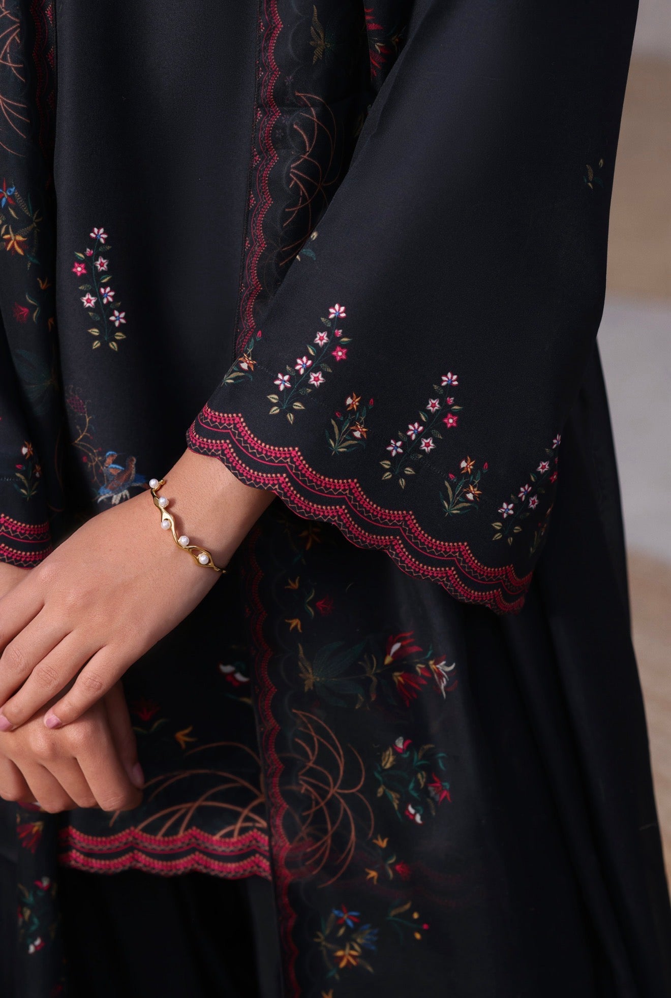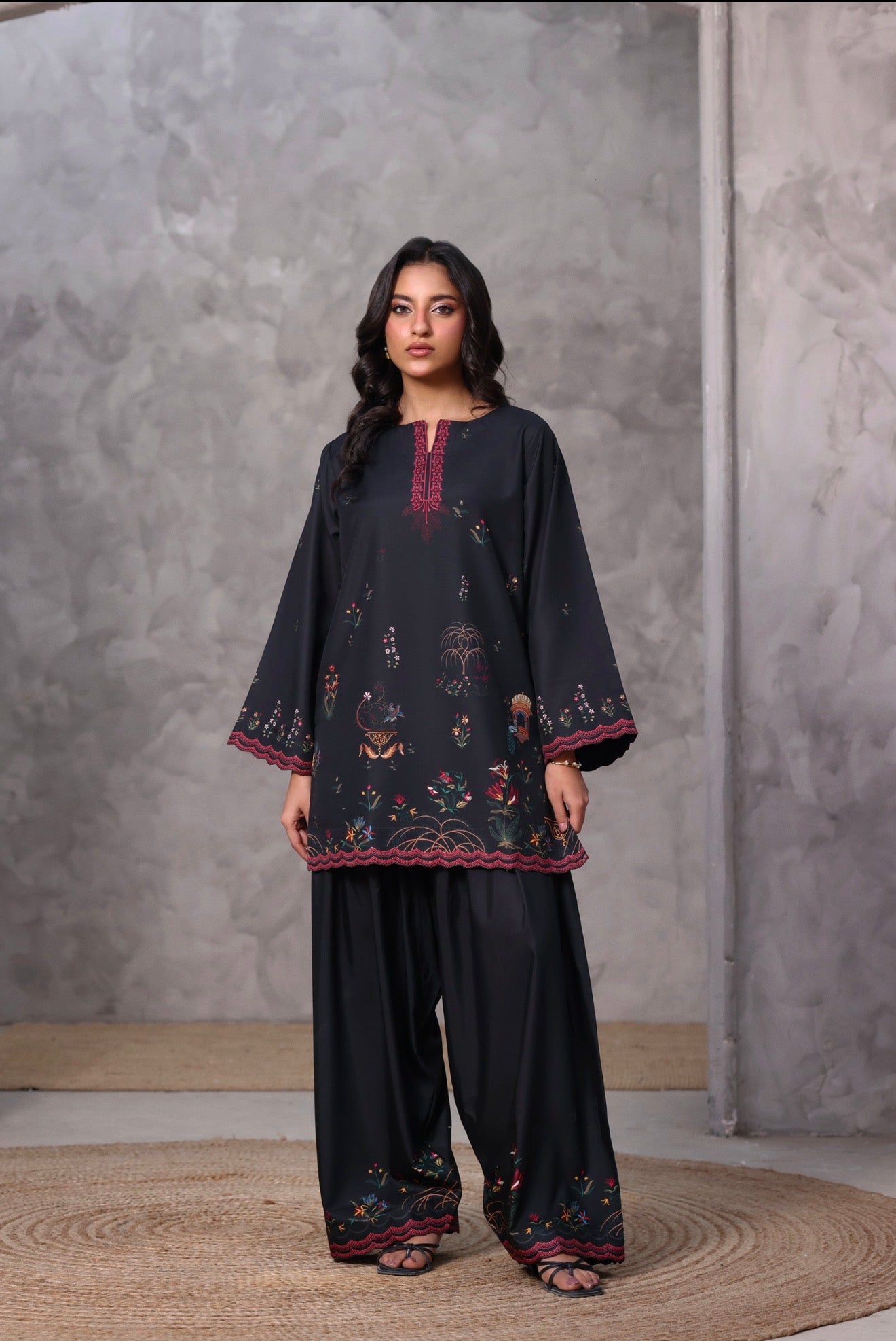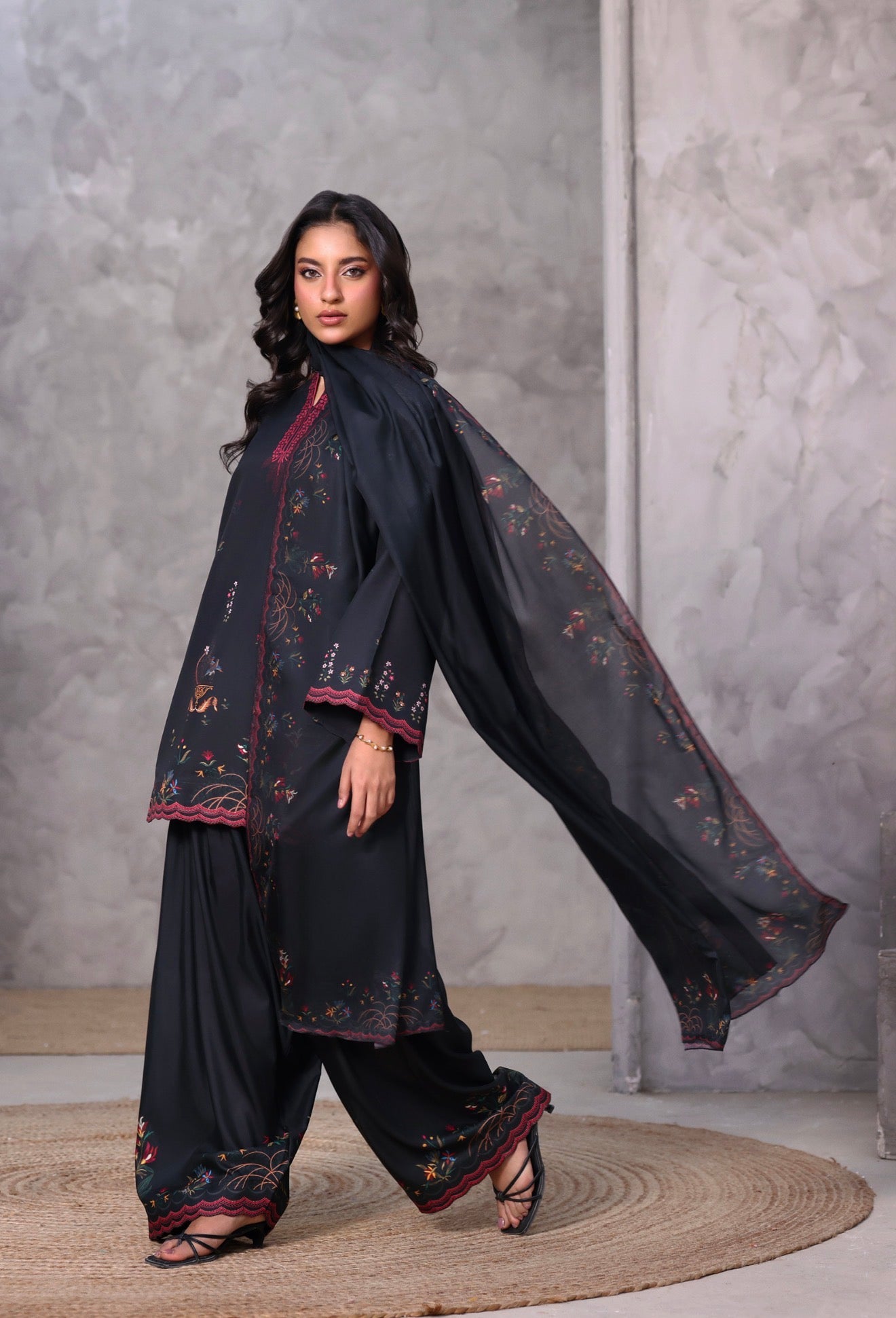 Designed in our in-house blended cambric, this ensemble features intricate cutwork detailing on the shirt and sleeves border. It is paired with a statement farshi shalwar for a flowy, traditional silhouette.