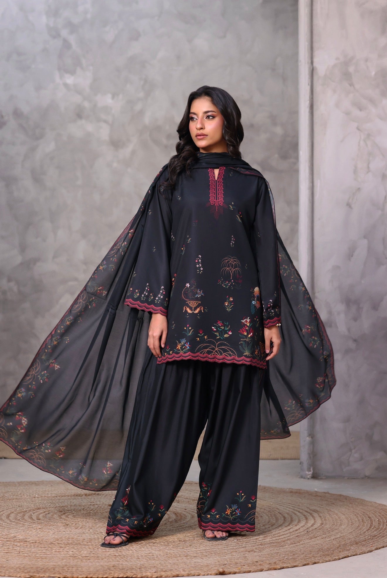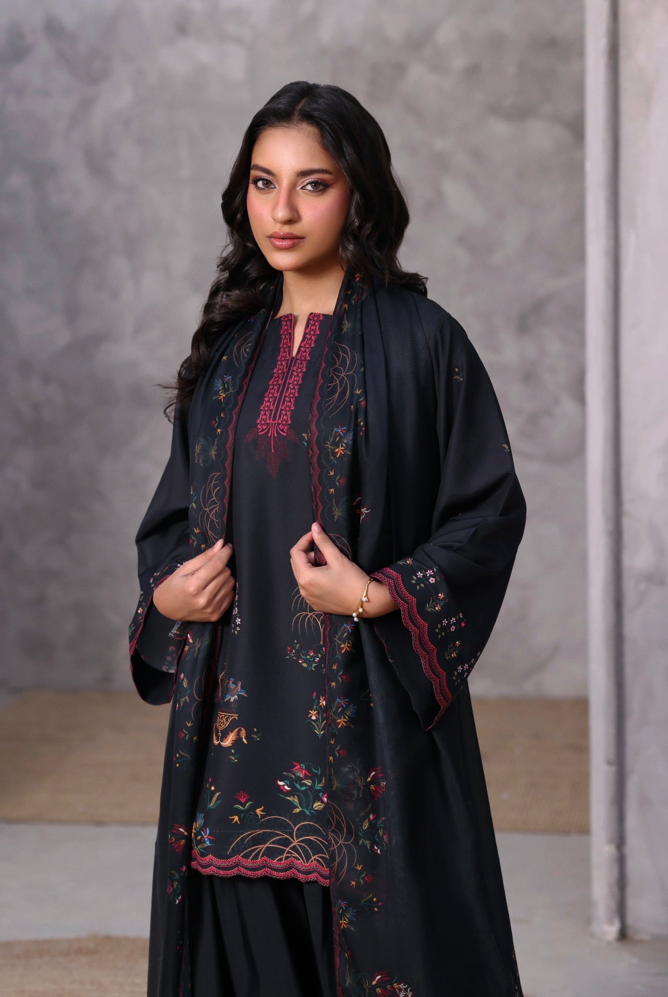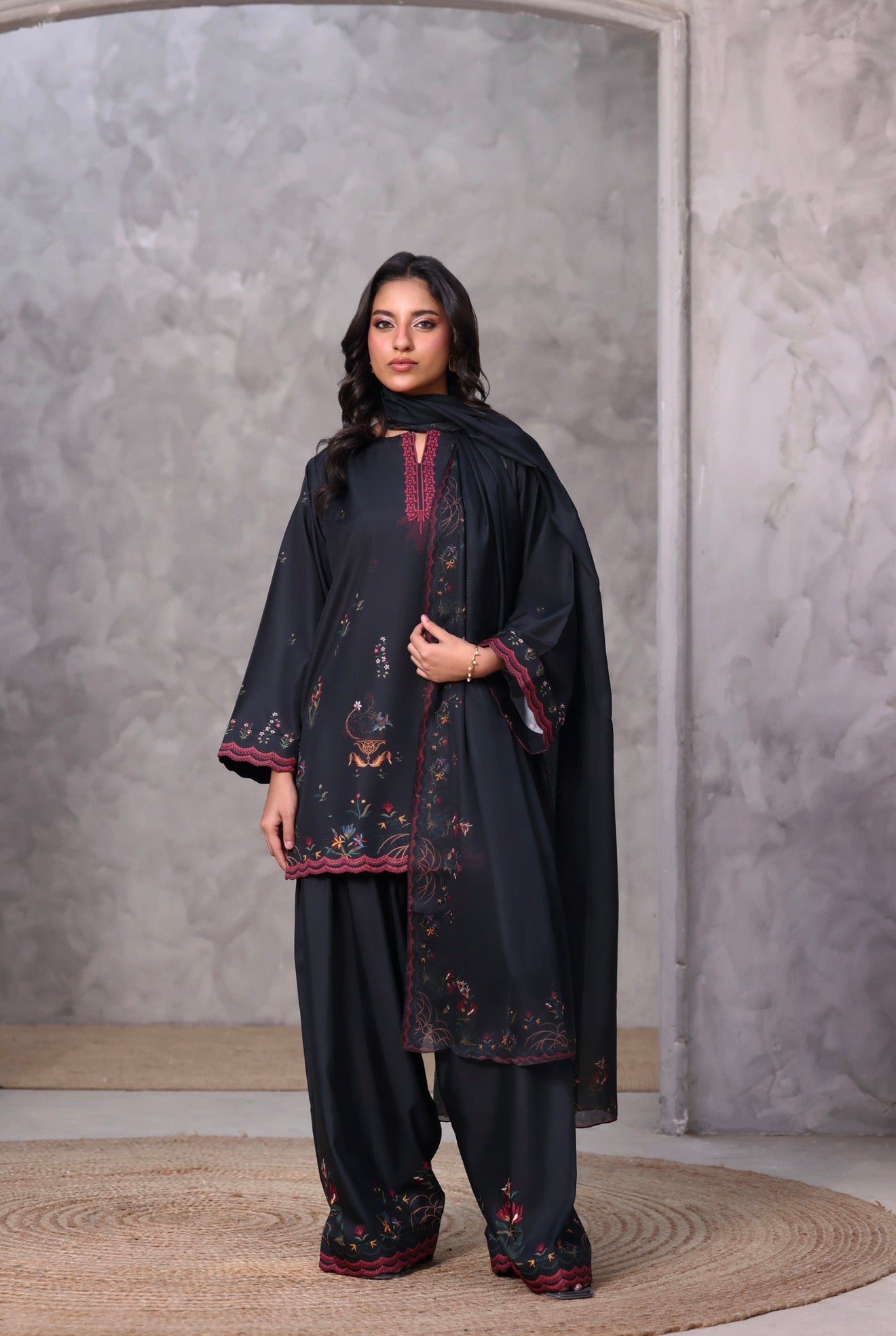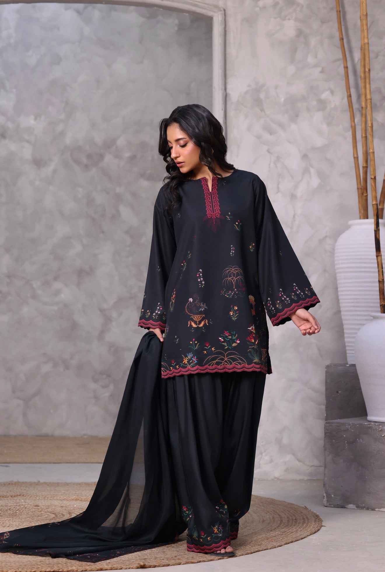 Designed in our in-house blended cambric, this ensemble features intricate cutwork detailing on the shirt and sleeves border. It is paired with a statement farshi shalwar for a flowy, traditional silhouette.